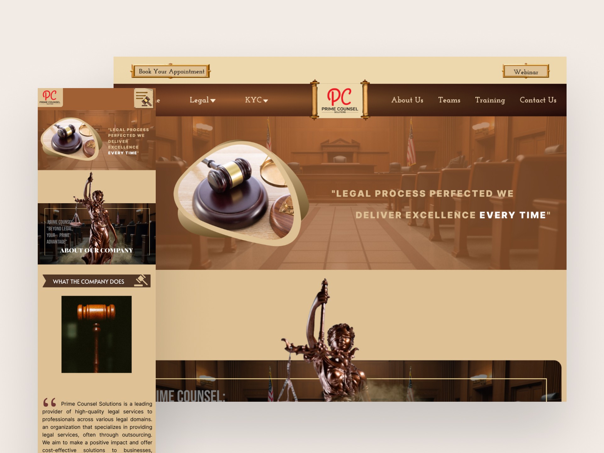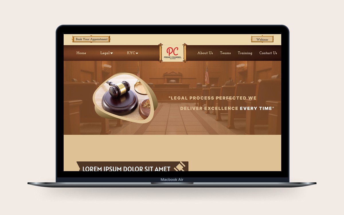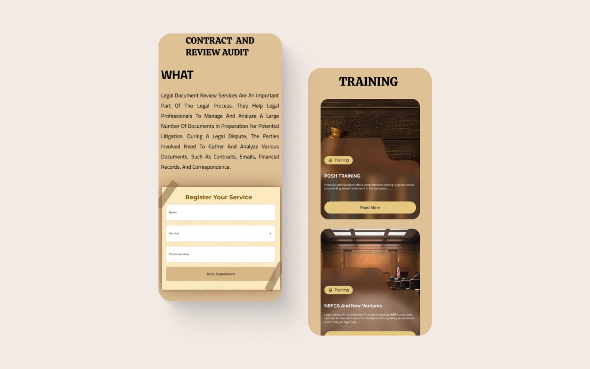 Prime Counsel Solutions is a professional legal service provider catering to NBFCs, law firms, and businesses with a strong focus on pre-litigation support, training, and outsourced legal services. The goal of this project was to revamp their old website into a modern, user-centric platform while preserving the essence of the legal profession through a historic, antique-themed aesthetic. The result is a full redesign crafted entirely by me, aimed at positioning Prime Counsel as a premium legal consultancy.