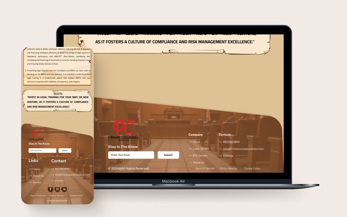 The new website elevated Prime Counsel’s brand identity and helped the firm better connect with startups, NBFCs, and legal institutions. Visitors now experience a seamless journey through structured legal service pages, training sections, and contact flows. The professional tone, coupled with the thematic visuals, established Prime Counsel’s credibility, encouraging more inquiries and interactions. The project successfully reflected their values of professionalism, accuracy, and integrity.