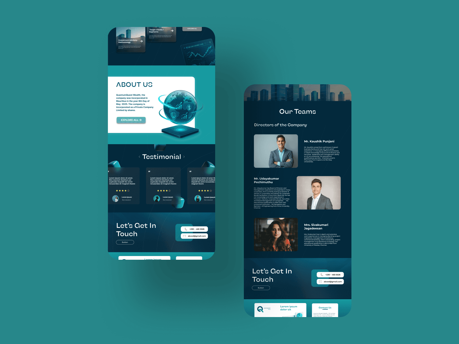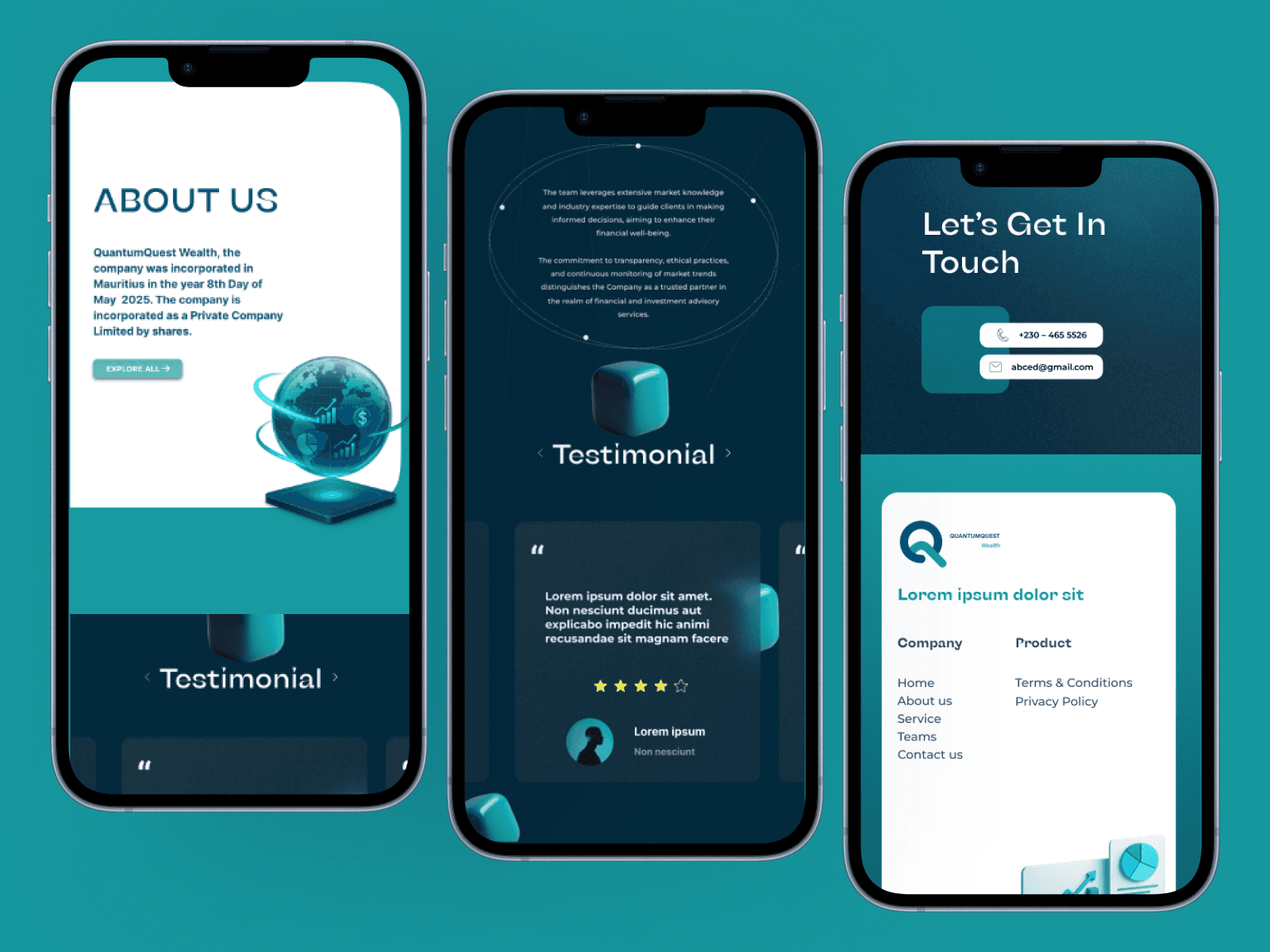 QuantumQuest Wealth approached us to design a sleek and informative website that would convey their expertise in financial planning and investment strategy. The goal was to create an impactful digital presence that resonates with both individual and institutional investors. Key features of the design include: A clean, high-trust color scheme blending teal (#094E77) and cyan (#179AA0) A visually appealing homepage with service cards, client testimonials, and contact CTAs Distinct pages for About, Services, Teams, and Contact Interactive elements and 3D visuals to make data-heavy content feel more engaging The site was designed in Figma and developed using modern frontend tools for speed and responsiveness.